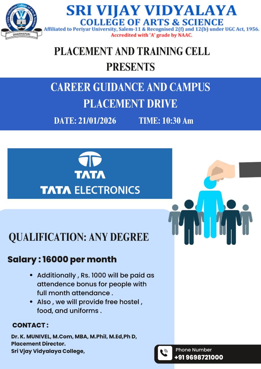 "During my academic visit to department of microbiology I have observed that highly active,well organised student _focused department with strong emphasis on laboratory base learning, workshops, project work and career guidance provide the students. Regarding SRI Vijay vidyalaya college of arts and science Nallamballi Dharmapuri Tamilnadu is highly values the academic contribution, leadership and positive influence.
