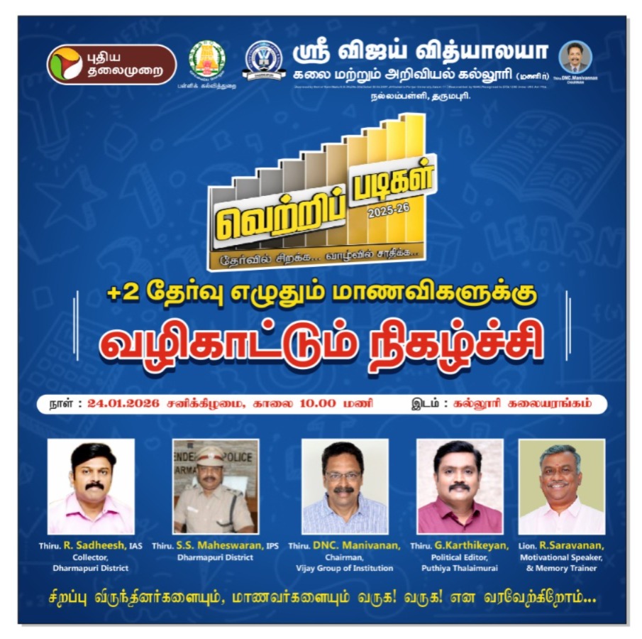 "I am delighted to share my warm greetings to Sri Vijay Vidyalaya, one of the finest and most progressive institutions in Dharmapuri. Your commitment to academic excellence and holistic student development is truly commendable. I extend my heartfelt wishes to the management, faculty, students, and parents of Sri Vijay Vidyalaya. May your institution continue to set new benchmarks in quality education and inspire generations of learners."